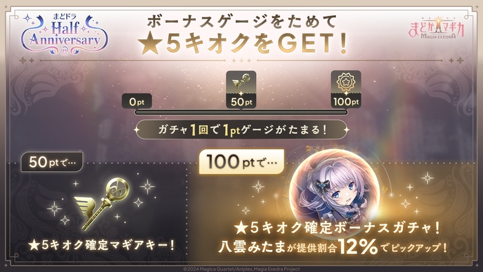 株式会社アニプレックス(本社:東京都千代田区 代表取締役 岩上敦宏 以下アニプレックス)は、アプリゲーム『魔法少女まどか☆マギカ Magia Exedra』(Magia Exedra:マギアエクセドラ)において、10月9日(木)12時より、ハーフアニバーサリーと調整屋さんシリーズの完結を記念して、新★5キオク 八雲みたまを実装し、ボーナスゲージ付きのピックアップガチャを開始いたしました。また、新ストーリーイベント「手料理でおもてなしパーティー!」やマギカストーンが最大3,000個獲得できるログインボーナスも開始いたしました。