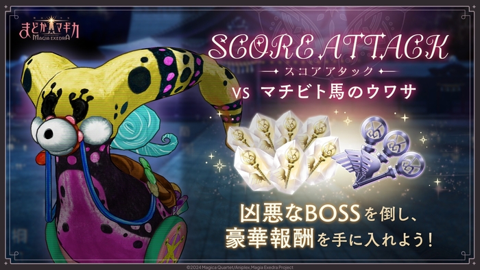 「スコアアタック」は自分のパーティの強さにあわせてボスのランクを選択し、より高いスコアを目指すバトルコンテンツです。報酬として、プリズムオーブ、★5キオク確定マギアキーのかけら、オープンヴェイス、こころの砂などが獲得いただけます。
