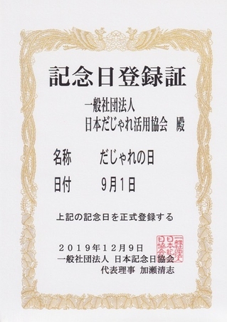 「だじゃれは世界を救う」を合言葉に、だじゃれを活用して世の中に笑顔と希望を拡げることを目指す一般社団法人日本だじゃれ活用協会(本部:神奈川県川崎市、代表理事:鈴木 英智佳)は、9月1日を『だじゃれの日』として定め、一般社団法人日本記念日協会より正式認定されたこと、かとう唯さん(ミュージカル女優&ダジャレント)が『だじゃれアンバサダー』に就任したことをお知らせします。