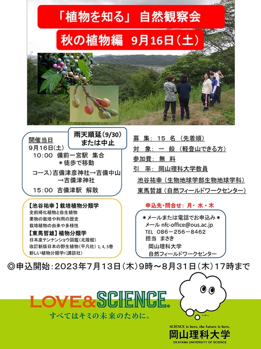 【岡山理科大学 自然フィールドワークセンター】「植物を知る」自然観察会 秋の植物編|日時:2023年9月16日(土)10:00~開催!参加無料 7月13日より申込開始!