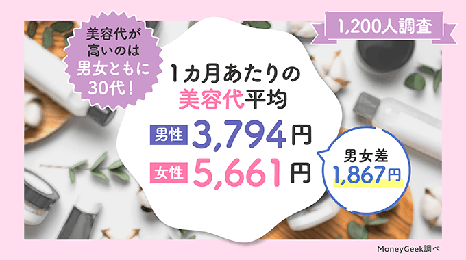 「1カ月あたりの美容代平均は女性5,661円、男性3,794円。一番お金をかけているのは男女ともに30代!」