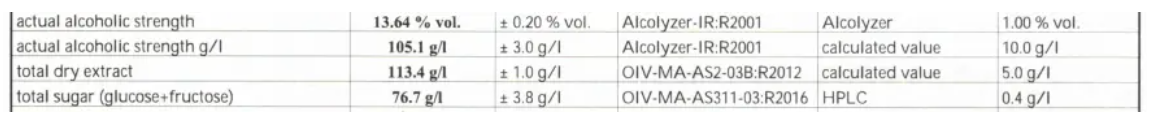 分析結果のスクリーンショットです。アルコール度数(actual alcoholic strength)が13.64%、残糖度(total sugar)が76.7グラムとなっています。
