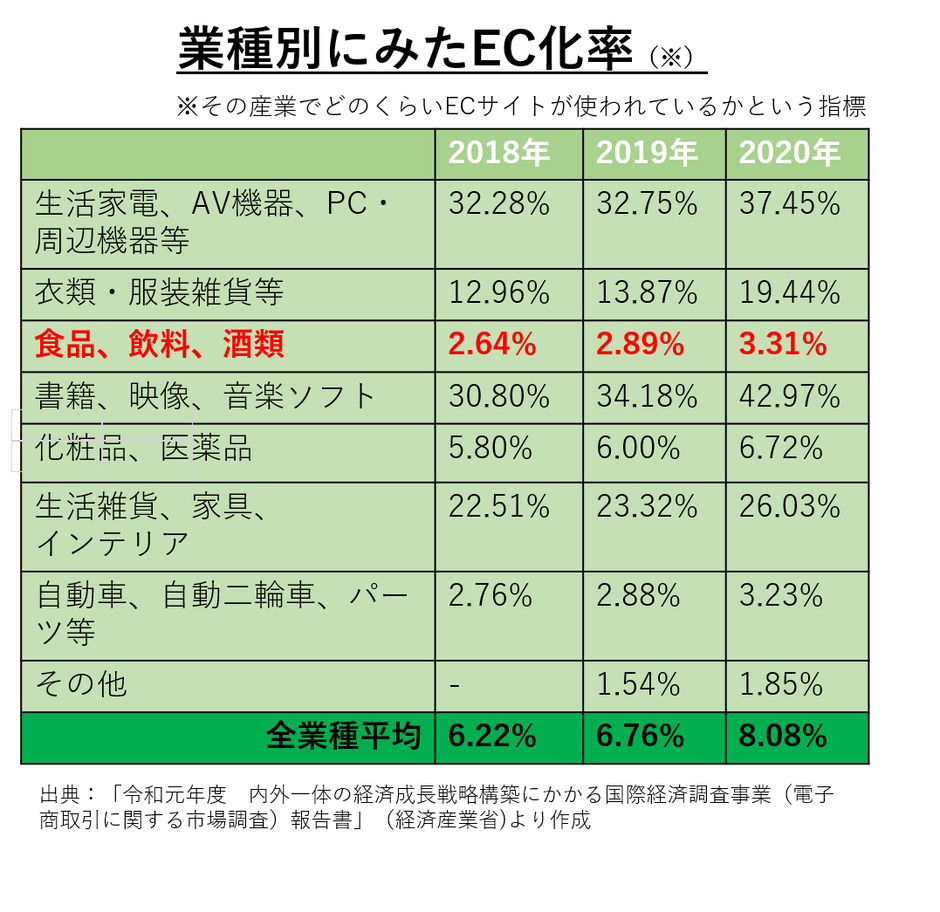 しかし、酒類を含む「食品産業」の分野のEC化率は3.31%。全産業(物販系)におけるEC化率は8.08%であることから、食品産業は、物販系の他業界に比べてEC化が進んでいないことが分かります。(参照:経済産業省HP「令和2年度産業経済研究委託事業(電子商取引に関する市場調査)