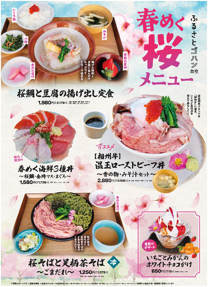 道の駅足柄・金太郎のふるさと(運営:株式会社相州・村の駅、所在地:神奈川県南足柄市)では施設内にある「ふるさとゴハン食堂」にて、桜の季節を祝う「桜メニュー祭り」を期間限定で開催いたします!3月14日(土)~4月5日(日)の10:00~15:30(ラストオーダー)で、春の味覚を使ったメニューが登場。桜鯛の定食や、いちごデザート、桜色のそばと足柄茶そばをセットにしたごまだれ風味のそばです。南足柄産のブランド牛「相州牛」と温玉、菜の花、いくらを添えた限定メニューも!桜見物後はふるさとゴハン食堂で、心弾む春のひとときをお過ごしください!