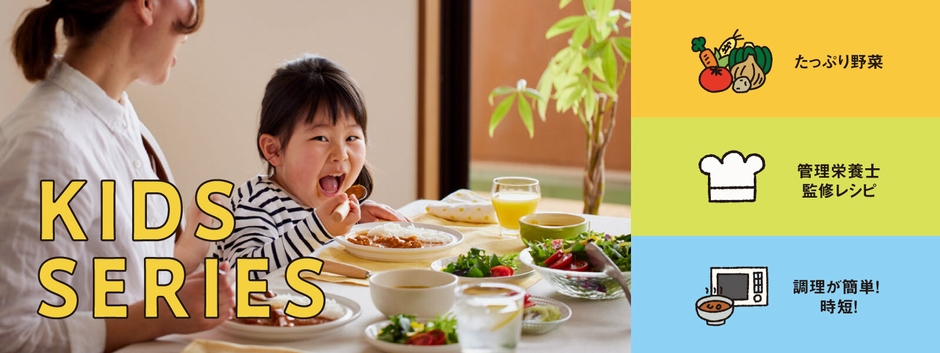 2017年より販売をしているキッズシリーズは、困ったときのお助けアイテムになってほしいとの想いから企画されました。販売から7年が経ち、困ったときのお助けアイテムとしてだけではなく、普段の食事にも使ってほしいという想いで、リニューアルを決めました。また、2歳ごろの幼児食が少ないというお声を受け、1歳ごろ~5歳ごろまで幅広い年齢に対応できるよう、商品ラインナップも7品から18品まで拡充しました。「こどもが食べるものこそ、安心安全でおいしいものを」という想いから、具材やソースに加える野菜は国産野菜を使用し、全品管理栄養士が監修しています。