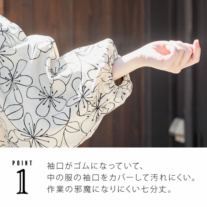 袖口はゴムで、袖口から着物が出ず、かつ家事の邪魔にならない丈となっています。