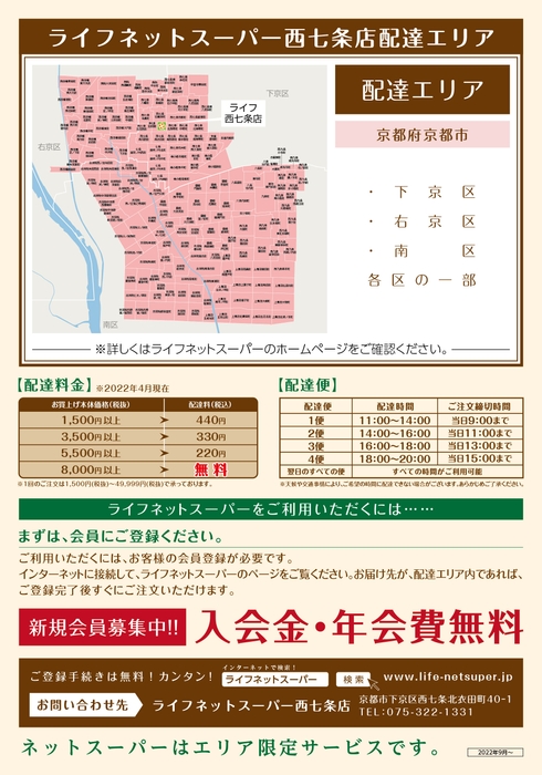 “おいしい” “ワクワク” “ハッピー” をお届けするライフコーポレーションでは、9月28日(水)より京都市下京区の「ライフ西七条店」で「ライフネットスーパー」のサービスを開始いたしました。これまで近隣のライフから配送していたエリアに加えて、京都市内の配達エリアの拡大が実現いたしました。