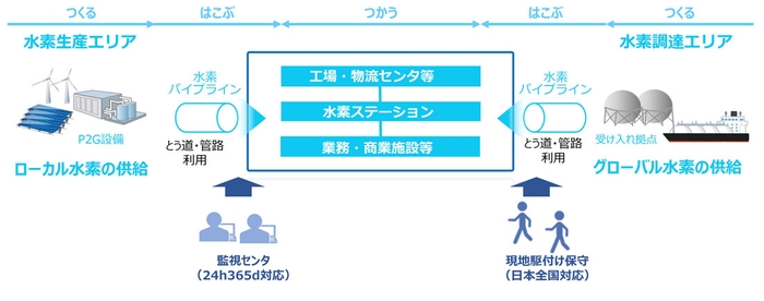 本事業では締結した協定に基づき、東京都空港臨海部における「つくる」「はこぶ」「つかう」それぞれの個別検討と「バリューチェーン全体」における事業性やロードマップ作成に関する検討を行います。