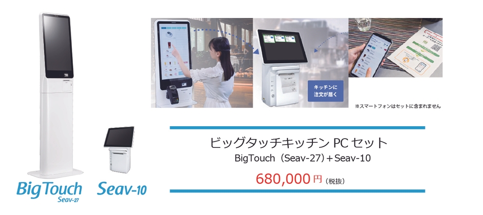 クラウドPOSレジ「リアレジ」の券売機(BigTouch27)、 タッチモニタ付キッチンプリンタ(Seav-10)と モバイルオーダーがセットになった 「ビッグタッチキッチンPCセット」発売