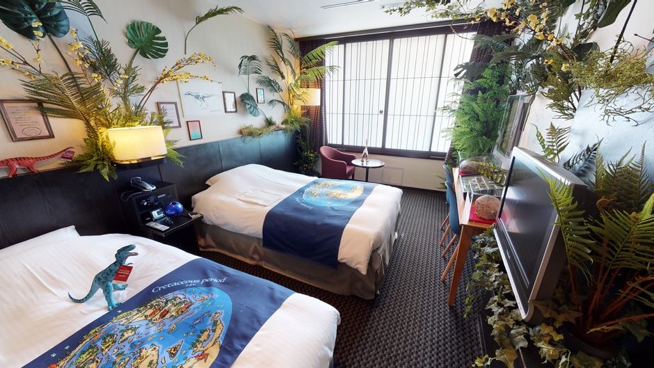 客室内の至るところにあるイラスト・骨格図にもご注目。躍動感あふれる恐竜のカラーイラストパネルとベッドスローの大陸移動イラストは、古生物研究家の川崎悟司氏によるものです。植物の間から顔を出す大迫力の「ティラノ