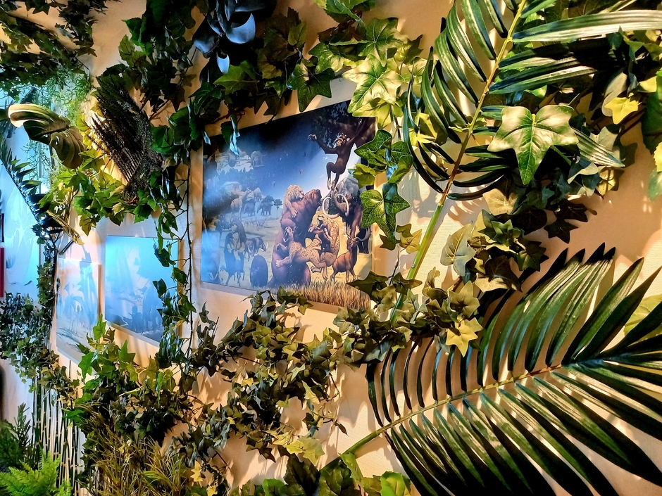 壁や天井は、古代からの種類・系統の植物をメインに、白亜紀のジャングルをイメージしたフェイクグリーンで大胆に装飾。(特別協力:京阪園芸株式会社)京都駅前にいながら、太古の森にいるかのような非日常気分を