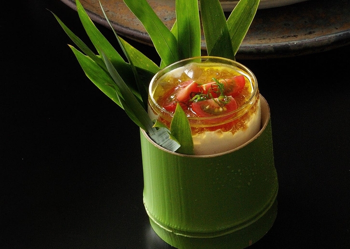 「山うに豆腐」とは、豆腐の味噌漬けのこと。雲丹を彷彿させるとろりとした食感と贅沢な味わいを堪能できるよう、滑らかなムース仕立てにしました。爽やかさと濃い甘みを持つトマト、香り高い天草のオリーブオイル、旨味を凝縮した出汁のジュレを組み合わせた一品です。