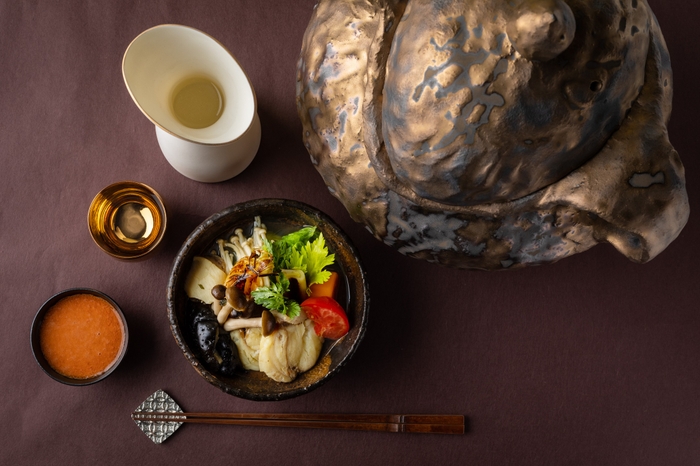 夕食は、冬に旬を迎える鮟鱇(あんこう)をはじめとした魚介や野菜を中心に仕立てられた滋味深い鍋料理です。素材の旨味が溶けだした出汁の風味や、鮟鱇の肝を使った特製のつけだれが、日本酒の味わいをより引き立てます。