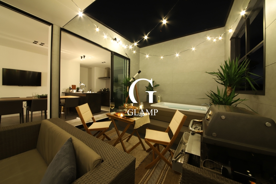 「GLAMP」は2階にジャグジー、ワーキングスペース、グリルコンロ、アウトサイドリビングセットを備えた、新しい住宅です。