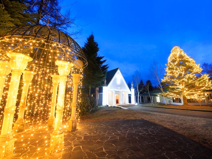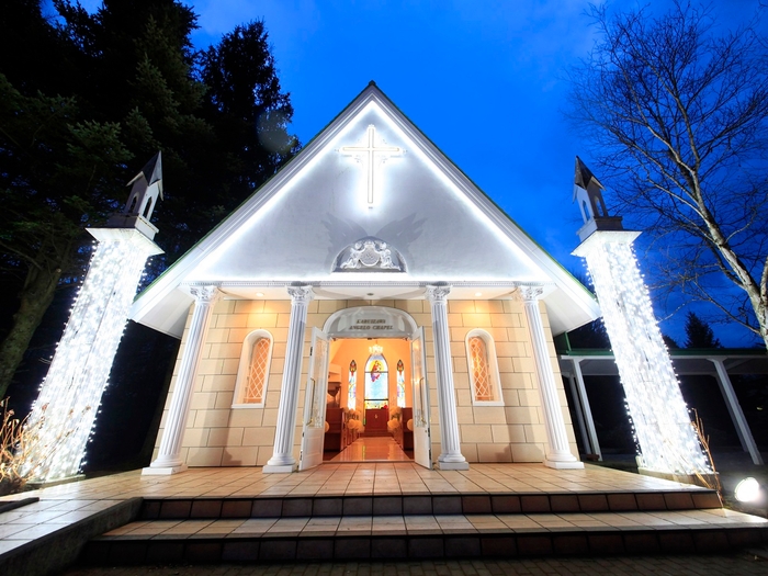 貸切のチャペルは、イルミネーションでライトアップされており美しい想い出のワンシーンとしてお写真に残すのにもぴったりです。