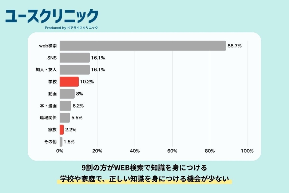 ペアライフクリニックが2025年2〜3月に来院者274名を対象に実施した意識調査でも、性感染症の情報を「WEB検索」で得ていると答えた人は88.7%に達しました。「学校から教わった」は10.2%、「家庭から教わった」はわずか2.2%にとどまっています。