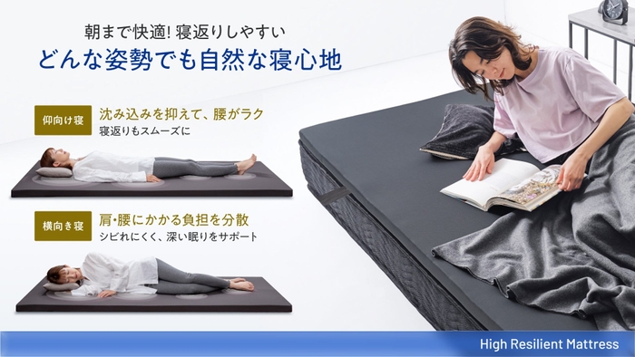 フラットタイプは厚さ5cm・190Nのやや硬めの高反発。「1枚敷くだけ」で寝心地が大きく変わることが特徴の一つです。沈み込みやすい腰や肩をしっかり支えて体圧を分散し、理想的な根姿勢へと導きます。床に直接敷いても底付き感がなく、サポート力のある寝心地を得られるため、毎日の睡眠環境をグレードアップできます。