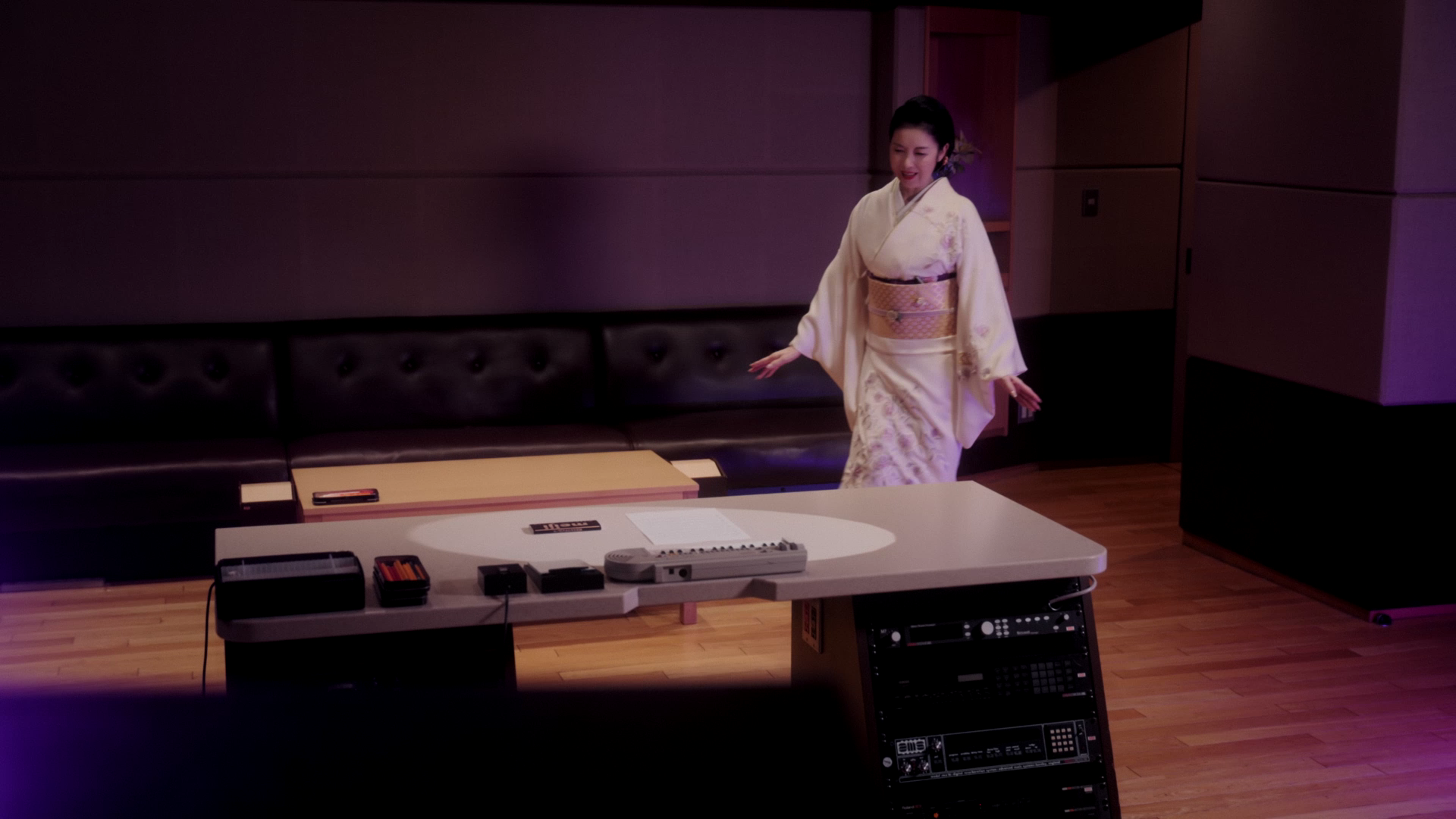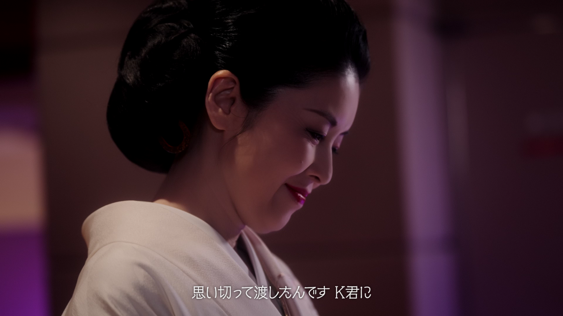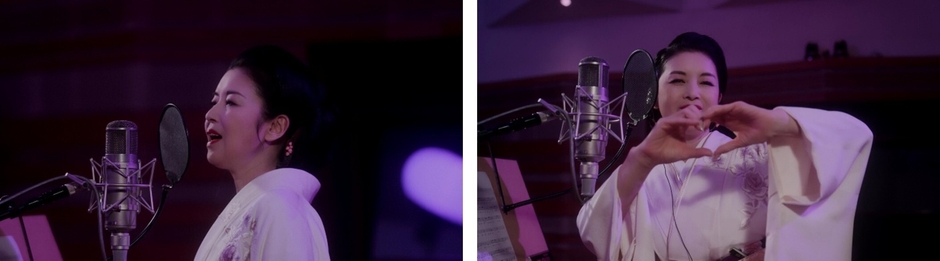 優美な着物姿で録音スタジオに現れた藤あや子さんは、「明治ミルクチョコレート」を見つけると、すぐさま駆け寄り「いや~大好き!」と言って手に取ります。「中学の時に転校生の男の子が編入してきまして、バレンタインデーの時に(「明治ミルクチョコレート」を)湯煎で溶かしてハートの型に入れて、思い切って渡したんです、K君に」と学生時代の思い出を語り始めた藤さん。しかし、「翌日、K君のお母さんから『手作りのチョコレートくれてありがとう』って言われて。K君何でお母さんに言っちゃったの?っていうちょっとショックな思い出があります(笑)」と当時の乙女心を明かしました。紫色のライトが光るレコーディング室に移動した藤さんは、「チョコレート、チョコレート、チョコレートは明治♪」と艶やかな歌声を披露します。ご自身の歌声をバックに、「明治ミルクチョコレート」を頬張り「ん~」としみじみ味わう藤さん。安定感のある歌声で歌い上げると、手でハートマークをつくり、かわいらしい一面をのぞかせます。最後にチョコレートをデスクに戻し、来月公開のアーティストへとバトンを繋ぎます。