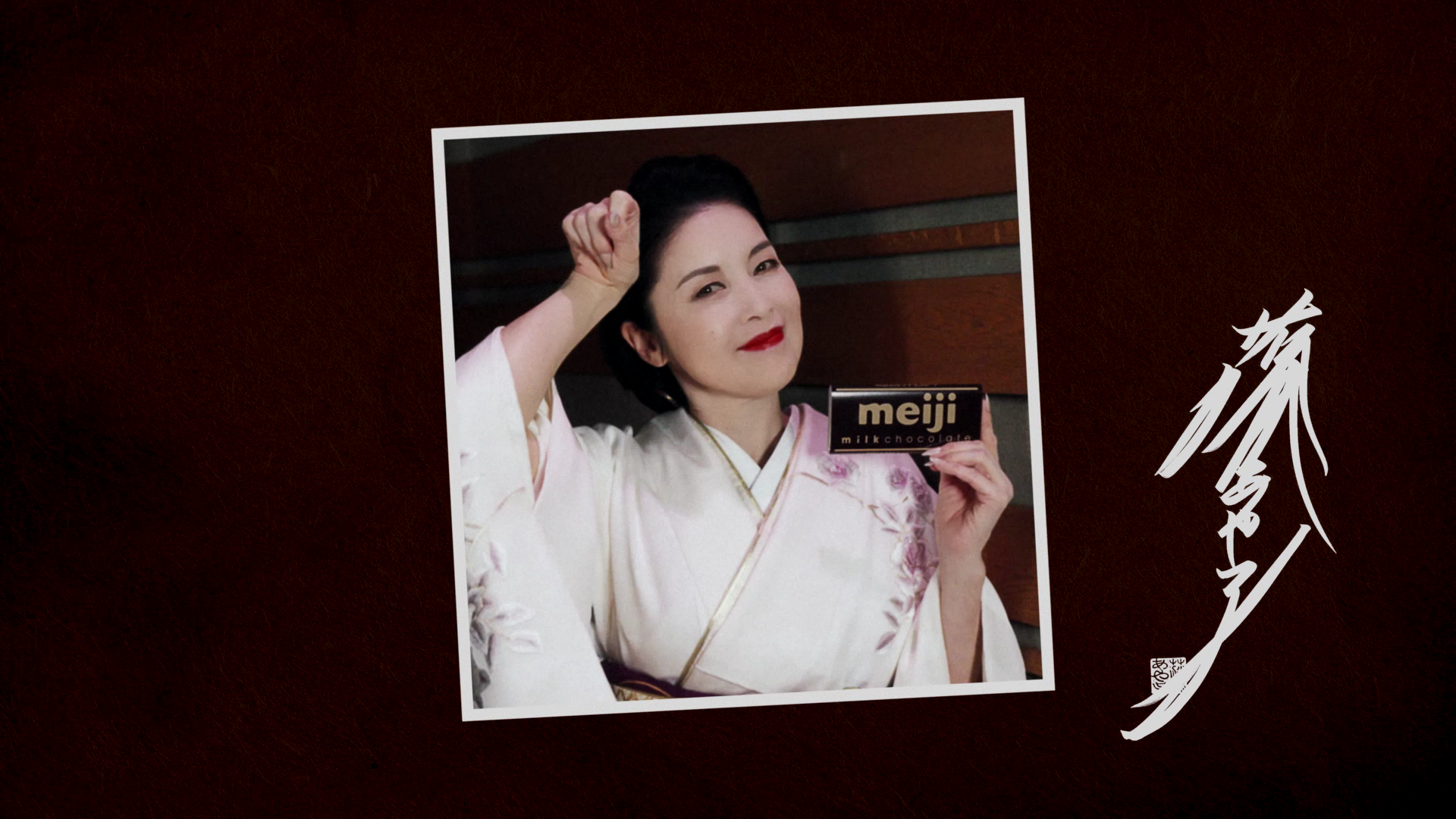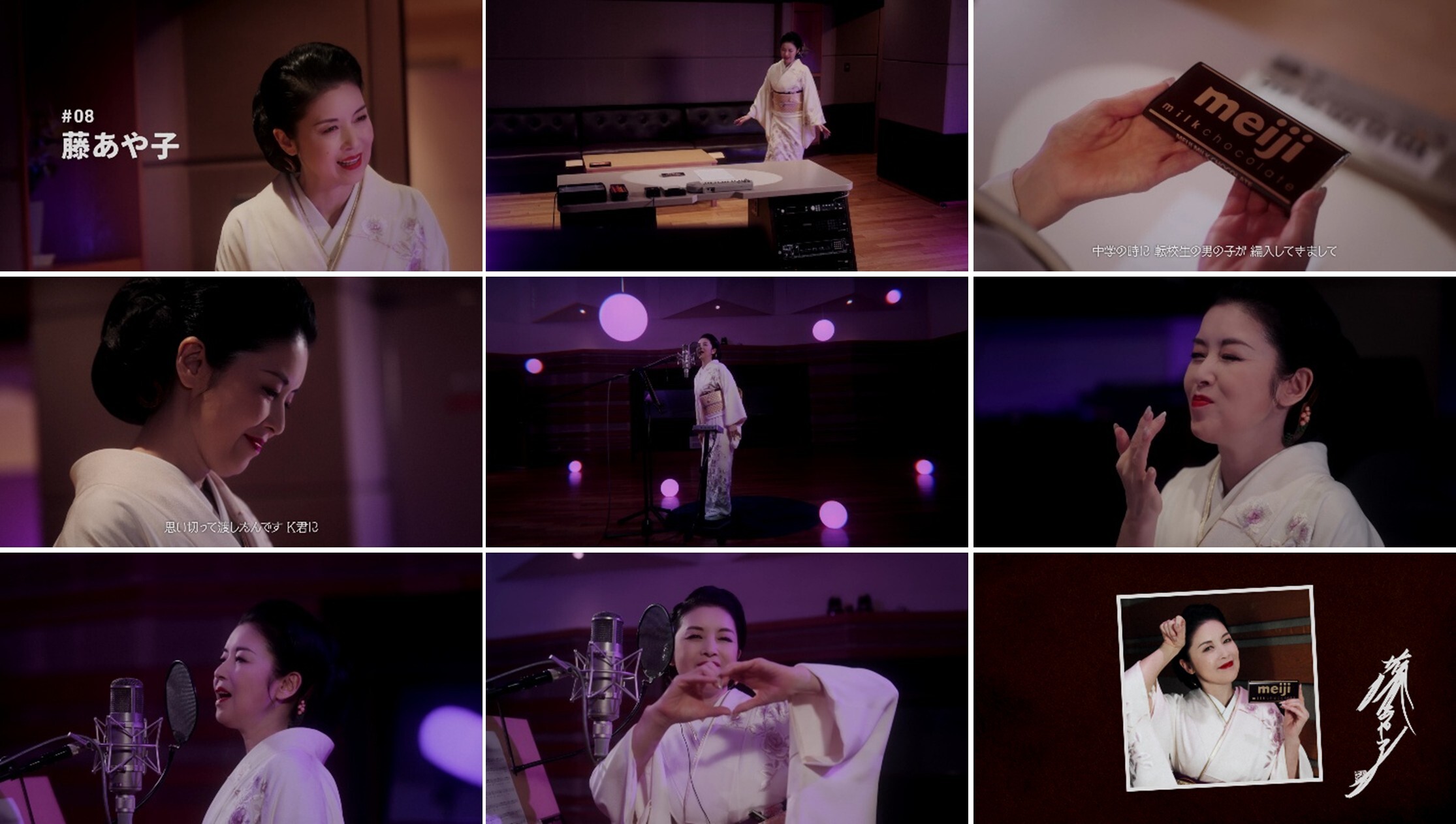 豪華アーティスト12組が明治チョコレートのテーマを歌い継ぐ “Melody of meiji”に藤あや子が登場! 艶やかな声で歌い上げる!次はイルカにバトンタッチ。 中森明菜、五木ひろし、TOSHI-LOW、FRUITS ZIPPER、 こっちのけんと、森高千里、新浜レオンが過去登場