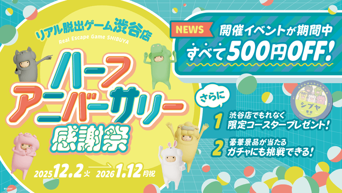 これまでご来場いただいた皆さまへの感謝の気持ちと、これから訪れるお客様にも楽しんでいただきたいという思いを込め、「リアル脱出ゲーム渋谷店 ハーフアニバーサリー感謝祭」を2025年12月2日(火)から2026年1月12日(月祝)の期間開催いたします!