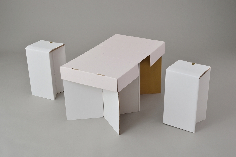 イス2脚とテーブルの足を収納して、そのケース自体がテーブルに変化します。