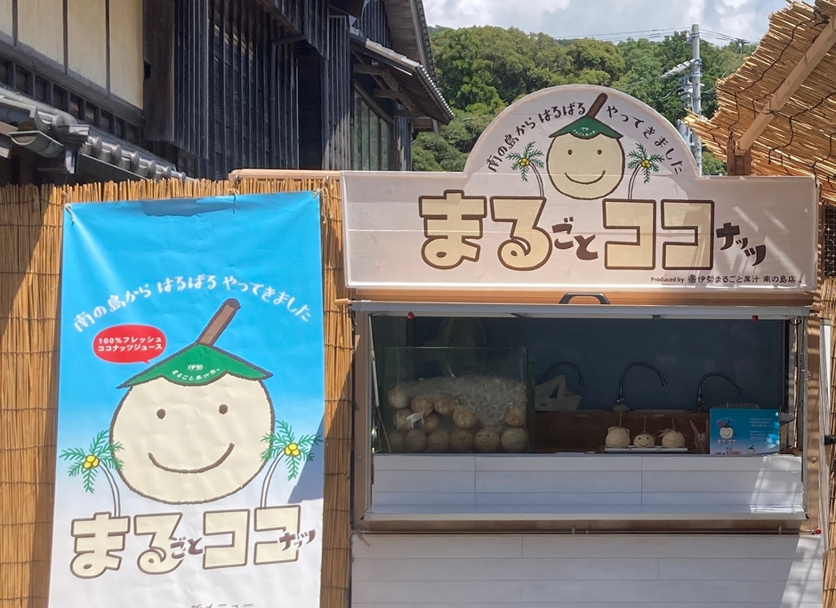 キンキンに冷えたオレンジやグレープフルーツ等の果物に何も加えずに、注文を頂いてから目の前でしぼるスタイルが人気の「まるごと果汁店」は、伊勢神宮内宮に通じるおはらい町通りで、行列のできるジュース専門店です。「まるごと果汁 南の島店」はその隣に夏の期間だけOPENするココナッツジュース専門店です。