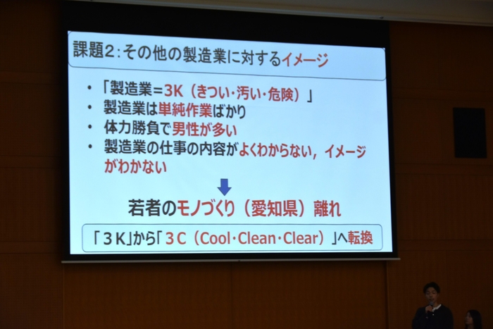 発表した池戸琉登さん(経営学部3年)は、少子高齢化を背景に愛知のモノづくりを支える人材不足がこれから深刻化すると指摘し、若年層の製造業へのイメージを変える必要性を説明。「きつい・汚い・危険の製造業3Kから、Cool・Clean・Clearの3Cへの転換を」と訴えました。