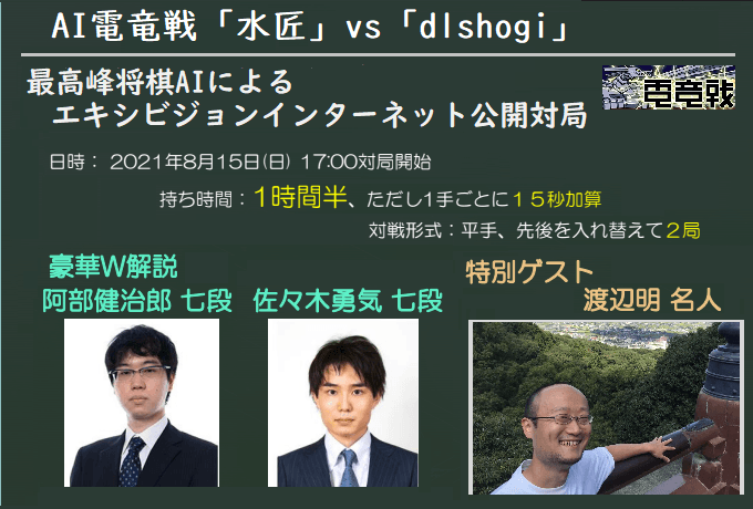 最高峰将棋AIによるエキシビジョン公開対局 “AI電竜戦「水匠」vs「dlshogi」”2021年8月15日開催! 解説にプロ将棋棋士2名、ゲストは渡辺名人