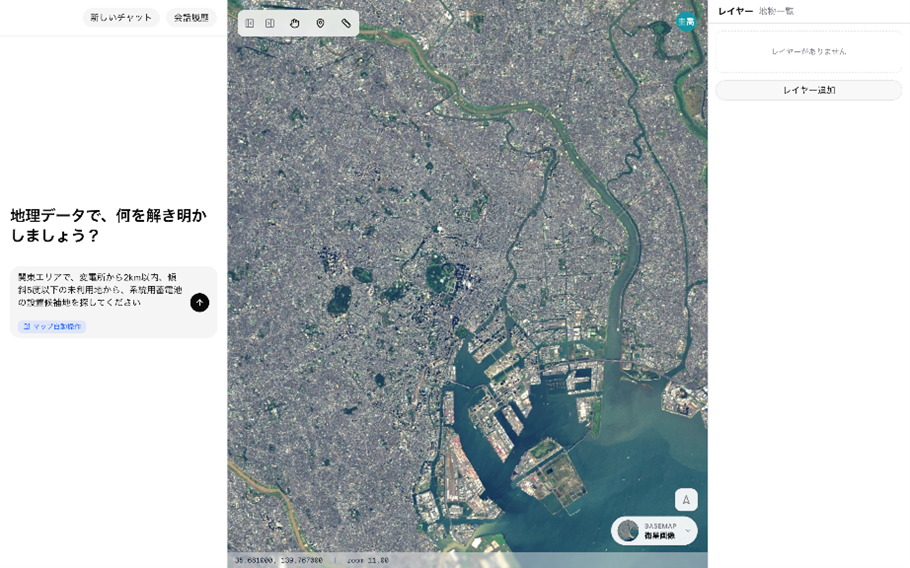 この課題に対し、「Orbital Sense」に新たに実装した地理空間分析AIエージェント機能を活用することで、 チャット形式でAIと対話をしながら、スピーディーに候補用地の絞り込みを実現することが可能となります。