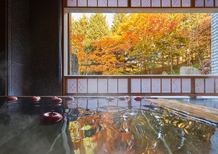 りんごが浮かぶ青森ヒバの湯殿から紅葉鑑賞