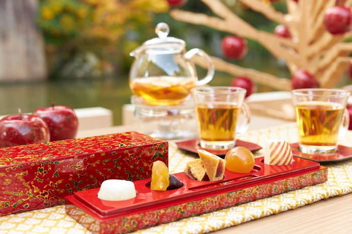 2019年に誕生した「津軽四季の水庭」では、季節によって様々な表情を見せる植栽と津軽こぎん灯篭や津軽びいどろなど、津軽の地に根付いた工芸が彩る空間を堪能することができます。秋は水庭に面したテラスに「津軽塗」のりんごが実る木がをしつらえます。水庭を囲む色づいたもみじと「津軽塗」のりんごの木を眺めながら、可愛らしいりんごのお菓子とお茶で寛ぎの時間を過ごすことができます。