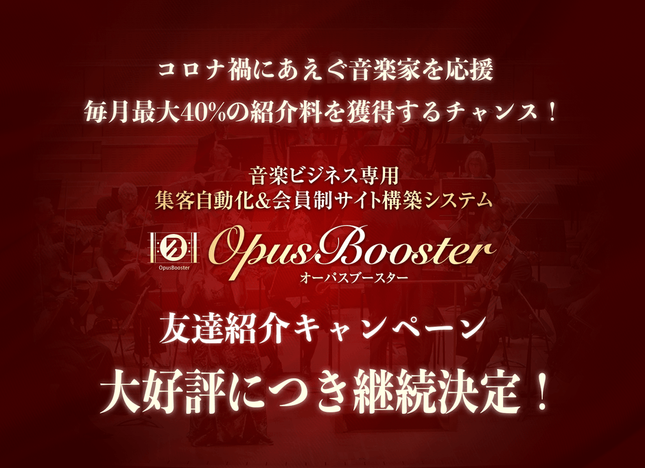 そこで当社では、コロナ禍にあえぐ音楽家に新たな収入の柱を構築していただくことを目的とし、「OpusBooster」ユーザーである音楽家に毎月最大40%の紹介料をお支払いする「OpusBooster友達紹介キャンペーン」を2022年3月30日(水)まで実施しておりましたが、好評につきキャンペーンを再開、今後は継続的にキャンペーンに参加できるようにいたします。