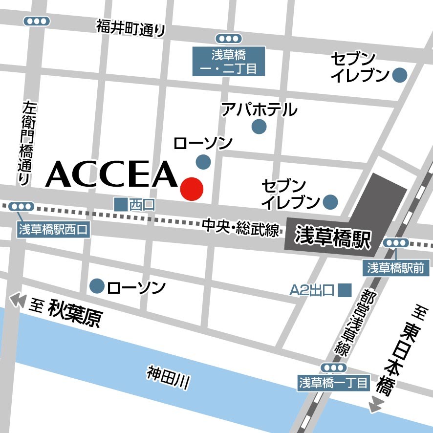 「アクセア浅草橋店」はJR「浅草橋駅」西口より徒歩1分、都営浅草線「浅草橋駅」より徒歩2分の好立地に位置し、公共交通機関でアクセスしやすい店舗です。