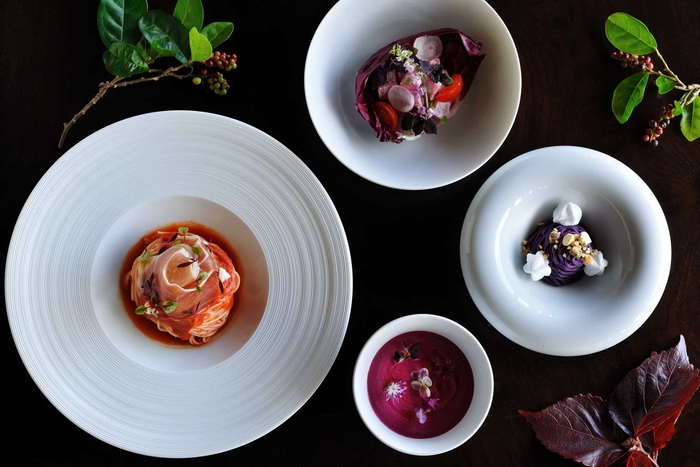 目に良いとされ、かつ竹富島で親しまれてきた食材を使った「ミースリンブランチ」を提供します。例えばハンダマ(水前寺菜)やヤモミ(シマヤマヒハツ)などは目の疲労感を和らげるとされるアントシアニン*5が豊富で、島の方々も生活に取り入れている食材です。紅芋やアセロラは、血液や目の水晶体など体の水溶性の部分で疲労物質を取る役割があるとされるビタミンC*6を多く含みます*7。そのほか、目の粘膜を健康に保つビタミンA*8に変換される栄養素*9を含む島唐辛子やシーショ(紫蘇)も取り入れた料理を揃えます。マグロと車エビのカクテルサラダ、ビーツのスープ、アセロラと生ハムのパスタ、紅芋モンブランの4品です。一般的に目に良いとされる栄養素をバランスよく含む色鮮やかなブランチです。