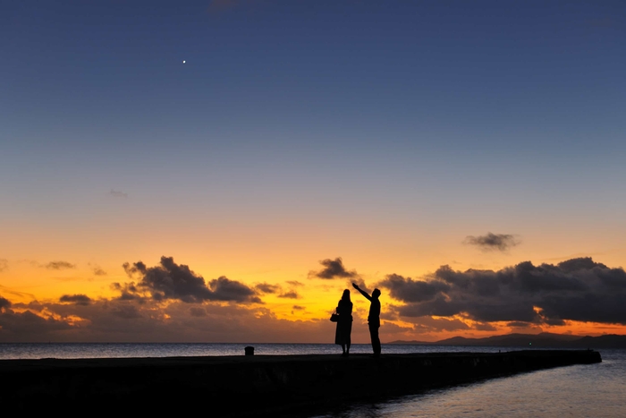 滞在2日目の夕暮れ時に一番星を見つけに出かけ、空が暗くなるにつれて広がっていく星々の鑑賞を楽しむ散歩です。星をはじめとする天体の知識が豊富な星のや竹富島のスタッフとともに、有形文化財に指定される島の夕日スポット「西桟橋」に向かいます。夕日で赤く染まる空を仰ぐ中で、ふとした瞬間に見つかる一番星。徐々に空が暗くなっていき、数えきれない程の星が輝き出します。滞在初日よりも目の緊張が和らいでいることを実感しながら、美しい星を眺められます。