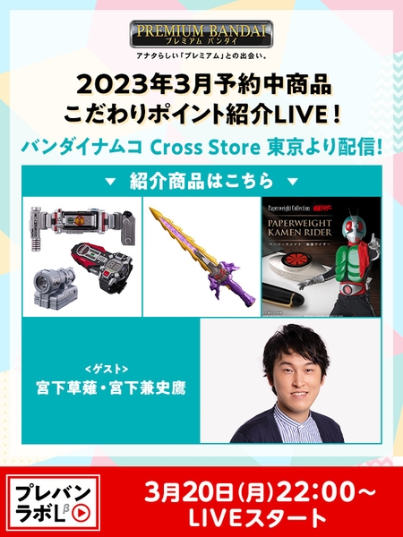 株式会社BANDAI SPIRITSが運営するバンダイナムコグループ公式通販サイト「プレミアムバンダイ」( https://p-bandai.jp/?rt=pr )は、ライブコマース番組「プレバンラボLβ(ラボベータ)」を2023年3月20日(月)22時(予定)に配信します。本番組では3月18日(土)にオープンする新施設「バンダイナムコ Cross Store 東京」(東京・池袋)より、プレミアムバンダイで予約受付中の商品をご紹介。ゲストにお笑い芸人宮下草薙・宮下兼史鷹(みやした けんしょう)さんをお招きしてお送りします。