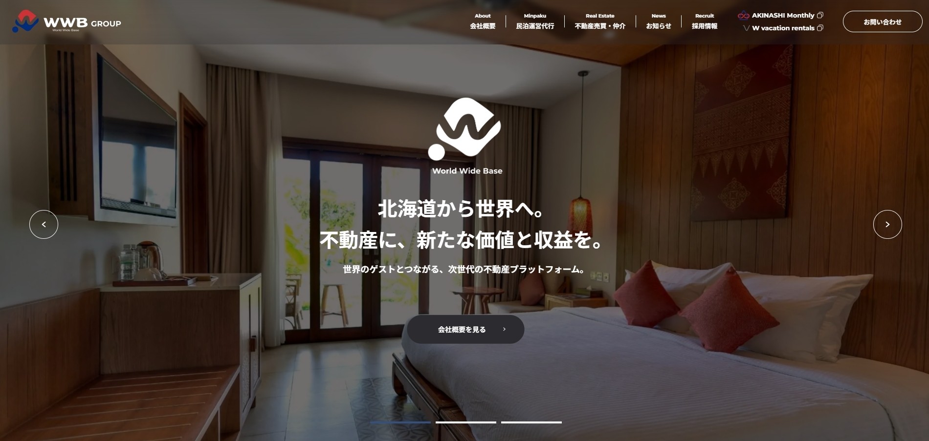 クウカン株式会社(本社:北海道富良野市、代表取締役:山本健太郎)は、このたび、北海道を中心に不動産売買仲介と民泊運営代行を展開する「ワールドワイドベースグループ(株式会社ワールドワイドベース / W vacation株式会社)」のコーポレートサイトの全面リニューアルを実施しました。
