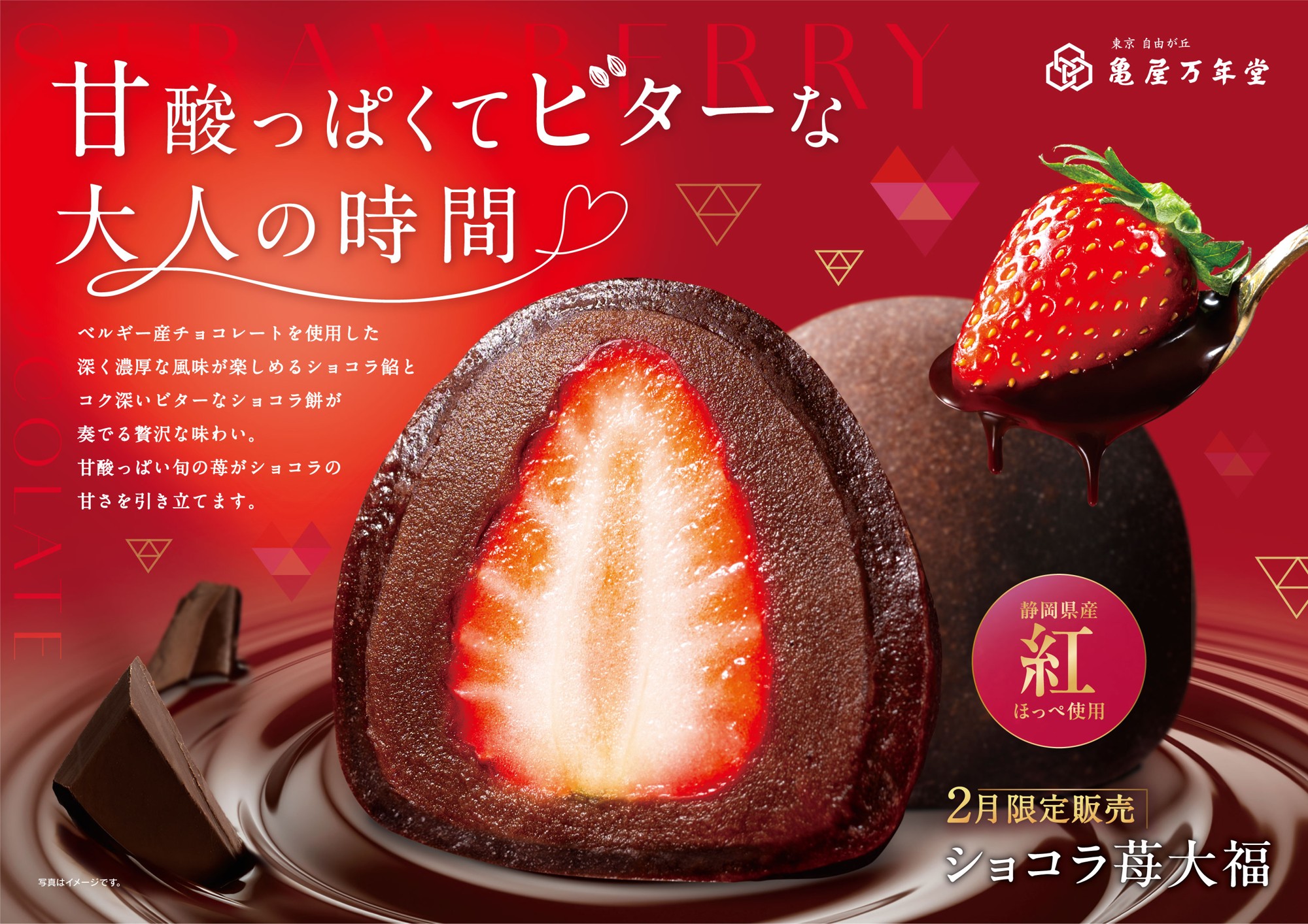 2月は甘酸っぱい旬の苺「静岡県産紅ほっぺ」と、コク深く濃厚なチョコレートの風味が楽しめるショコラ餡とショコラ餅を合わせた『ショコラ苺大福』(1個324円(税込)・期間限定)を直販店舗(東京・神奈川17店舗)にて期間限定で販売いたします。
