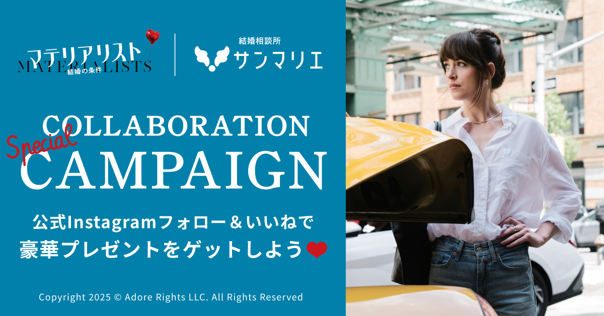 映画『マテリアリスト 結婚の条件』×結婚相談所サンマリエ 異色のタイアップ決定!