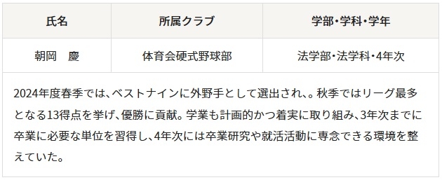 優秀な学業成績及び競技成績や運動部活動等への貢献を残して文武両道を実践する他の学生の模範となる個人を表彰する。
