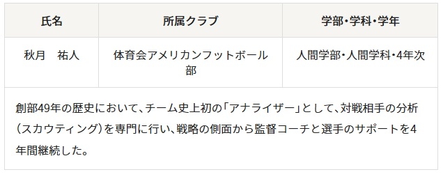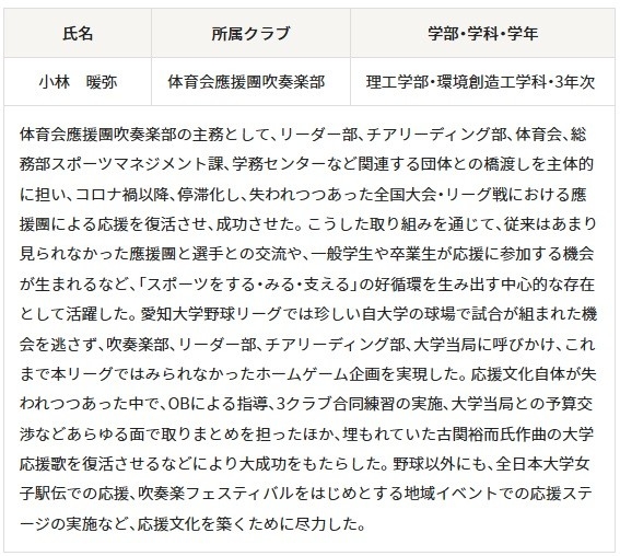 大学スポーツを支援することで、大学スポーツの振興に寄与した個人を表彰する。