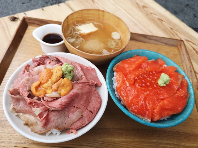 南足柄や箱根周辺の美味しい食材を2種類の丼ぶりに仕上げました。「ふるさとゴハン食堂」の大人気商品、「相州牛ウニとろ牛めし」と「金太郎マス」を使用した「金太郎マスといくら丼」のミニ丼セットです。