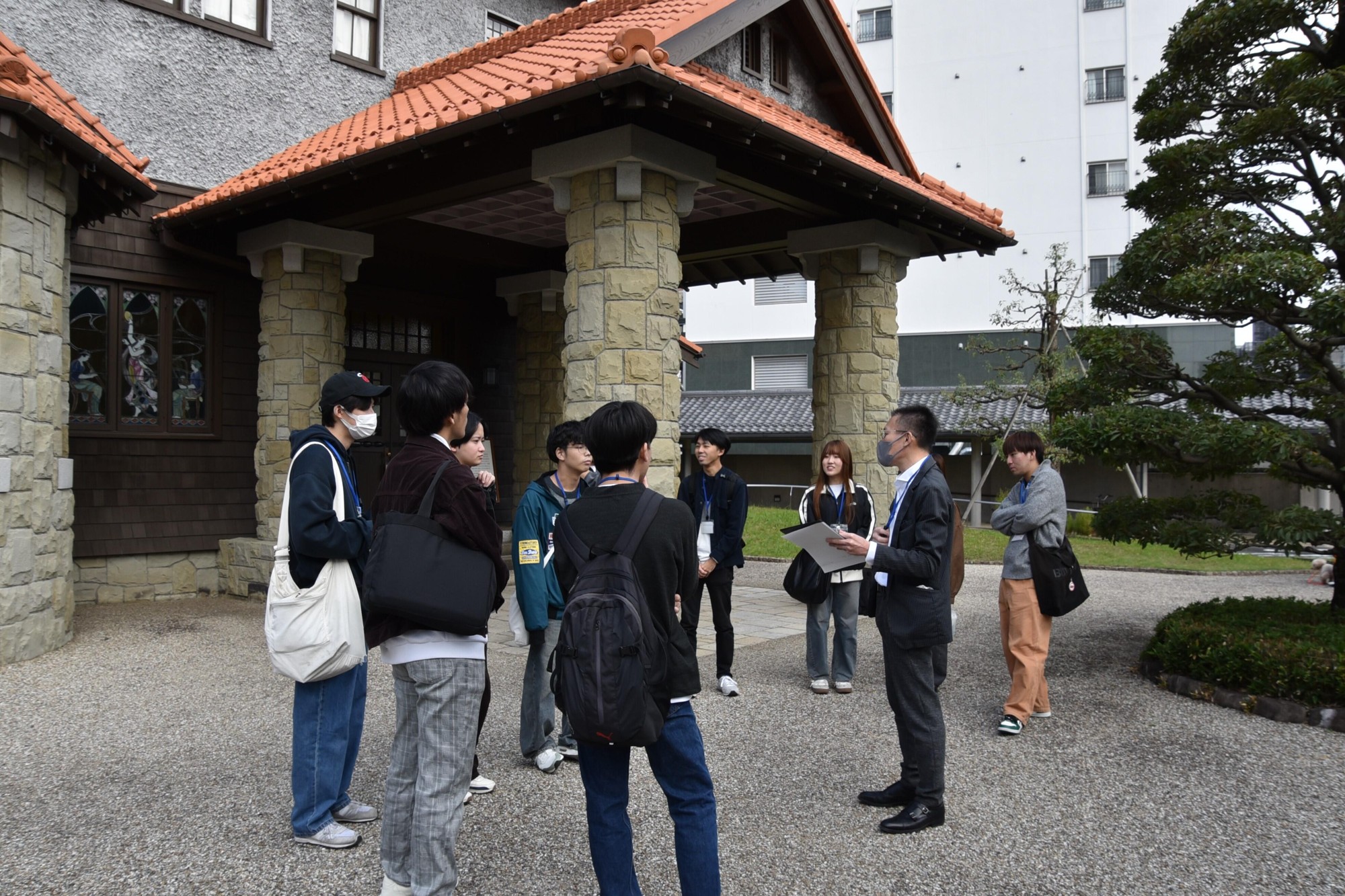 都市情報学部の2年次開講科目「フィールド調査の方法」を受講する学生たちが11月8日、名古屋市東区の「文化のみち」エリアにある「二葉館」と名古屋を代表する観光スポットの名古屋城、オアシス21でフィールド調査を実践しました。観光を活かしたまちづくりに向けて、訪れたきっかけや事前に入手した情報などを尋ねるアンケート調査を行い、観光客らの意識を調べました。