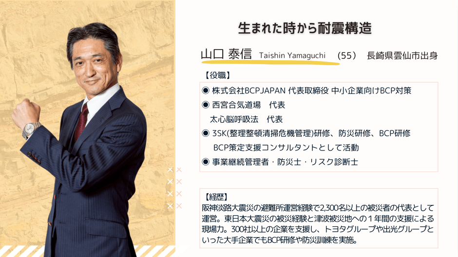 阪神淡路大震災にて約2,300名の避難者支援を経験し、その後防災や3SK(整理整頓清掃・危機管理)関連に31年間以上にわたり自治体・病院・ホテル・企業などの災害対応やBCP訓練を支援してきました。