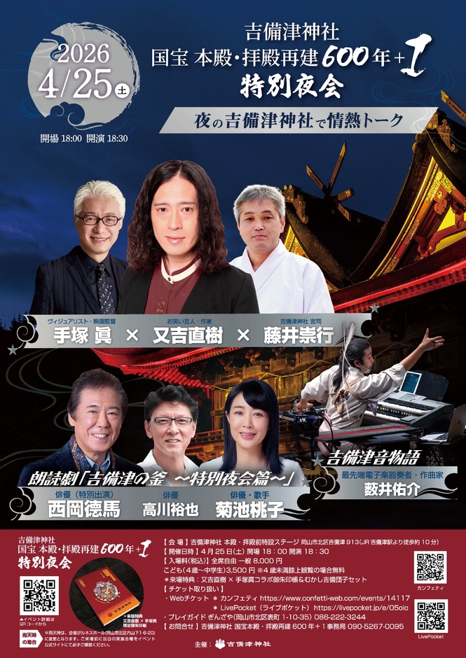 吉備津神社(岡山市北区)は、「国宝 本殿・拝殿再建600年+1」の新たな幕開けを飾る特別企画「特別夜会」を、いよいよ4月25日(土)に開催いたします。通常非公開の夜間に境内を開放し、国宝建築を背景に “トーク×朗読劇×音楽”が交錯する、一夜限りの特別な体験が目前に迫りました。