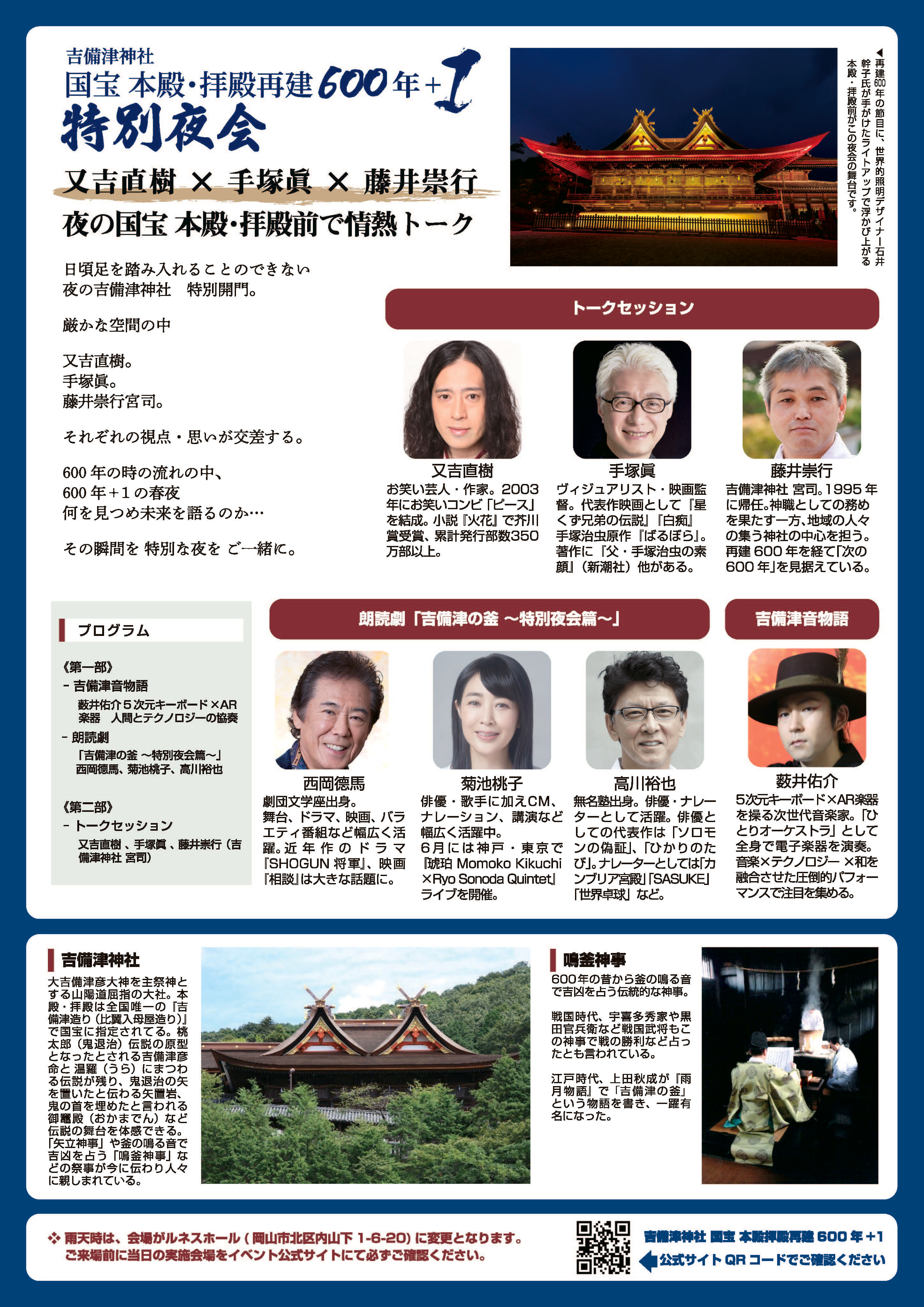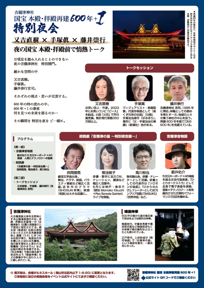 新たに俳優 菊地桃子氏の朗読劇出演が決定し、歴史と物語が重なる吉備津神社の夜に、いっそう彩りが加わります。当日は、ヴィジュアリスト・映画監督 手塚眞氏、お笑い芸人・作家 又吉直樹氏、吉備津神社宮司 藤井崇行氏が登場し、「夜の吉備津神社で情熱トーク」をテーマに、この夜だけの公開セッションを展開します。