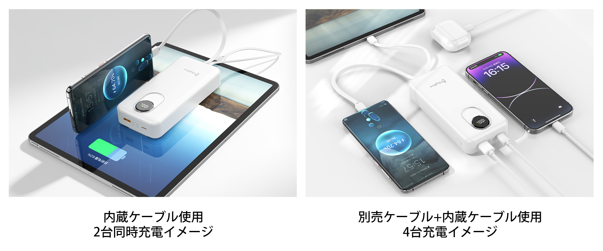 また、別売りのケーブルと内蔵ケーブルとの併用で、最大4台の同時充電にも対応します。複数台のスマートフォンやデバイスをまとめて充電したい場面で高い利便性を発揮します。