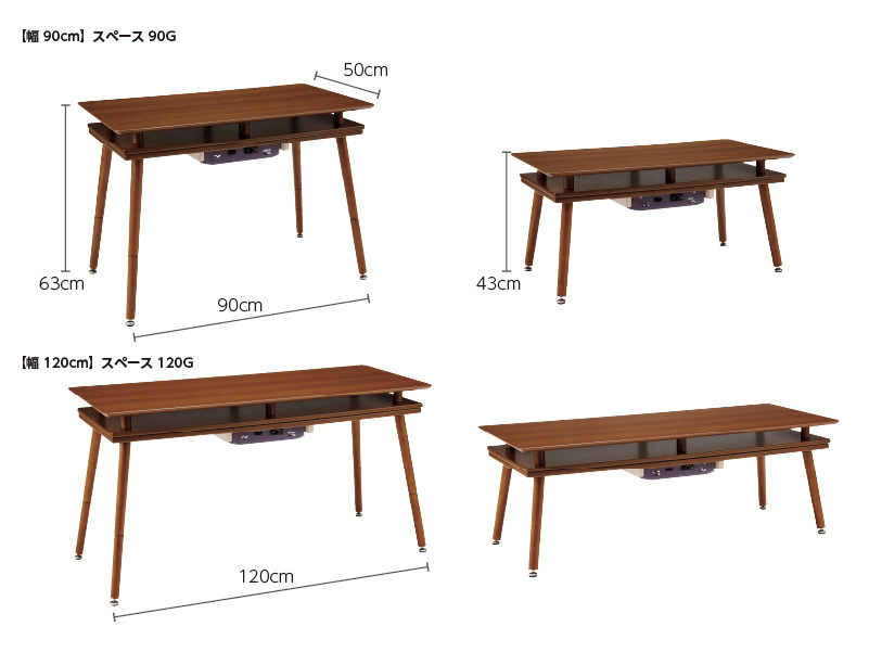 【幅90cm】はワンルームやワークスペースに、【幅120cm】はスモールファミリーにおすすめです。2サイズ共に奥行は50cmでソファとテレビの間に置きやすく、幅120cmはテレビが見やすい横並びに入れるこたつとして開発されました。