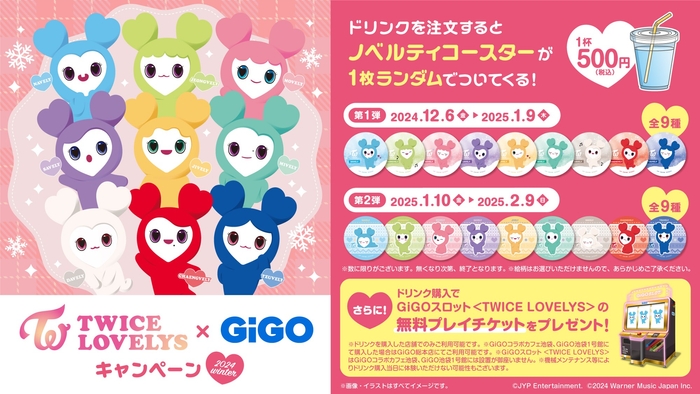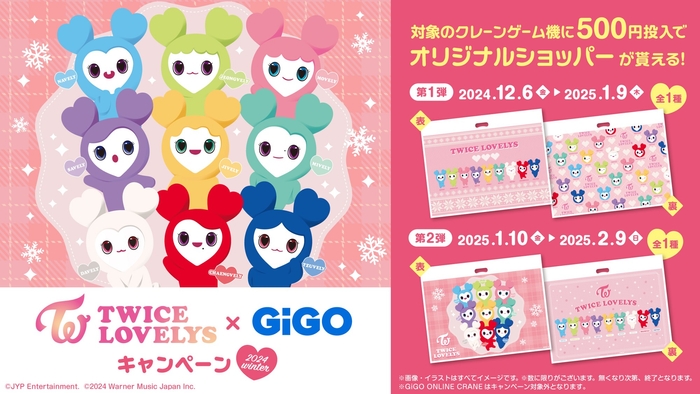 株式会社GENDA GiGO Entertainment(本社:東京都港区 代表取締役社長:二宮 一浩 以下、当社)は、GiGOグループのお店におきまして、日本デビュー7周年を迎えたアジアNo.1ガールズグループ『TWICE』からうまれたキャラクター『TWICE LOVELYS』のとのコラボレーションキャンペーン「TWICE LOVELYS×GiGOキャンペーン 2024 WINTER」を開催いたします。