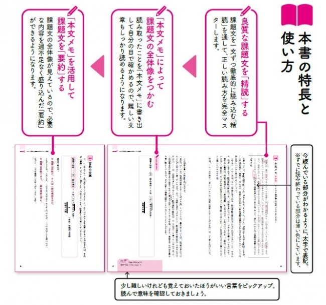 そこで本書では、まず良質の課題文を一文一文丁寧に読み解き、段落ごとに要点を整理し、メモに書き出していくことを行います。その一連の工程をじっくりとお伝えします。